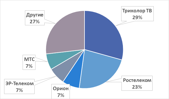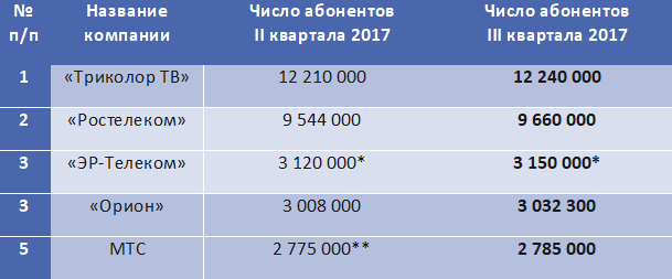 Лидер рынка, спутниковый оператор «Триколор ТВ», за 3Q 2017 год увеличил абонентскую базу на 30 тыс. подписчиков, до 12,24 млн домохозяйств. Второй по величине игрок, «Ростелеком», увеличил базу подписчиков на 116 тыс, до 9,66 млн. Идущий третьим «Эр-Телеком» увеличил базу на 30 тыс, до 3,15 млн. Рост компании в 2017 году происходит в основном не из-за органического роста, а сделок M&A. «Орион» увеличил базу на 24,3 тыс, до 3,032 млн. абонентов. МТС увеличила абонентскую базу на 10 тыс, до 2,785 млн.