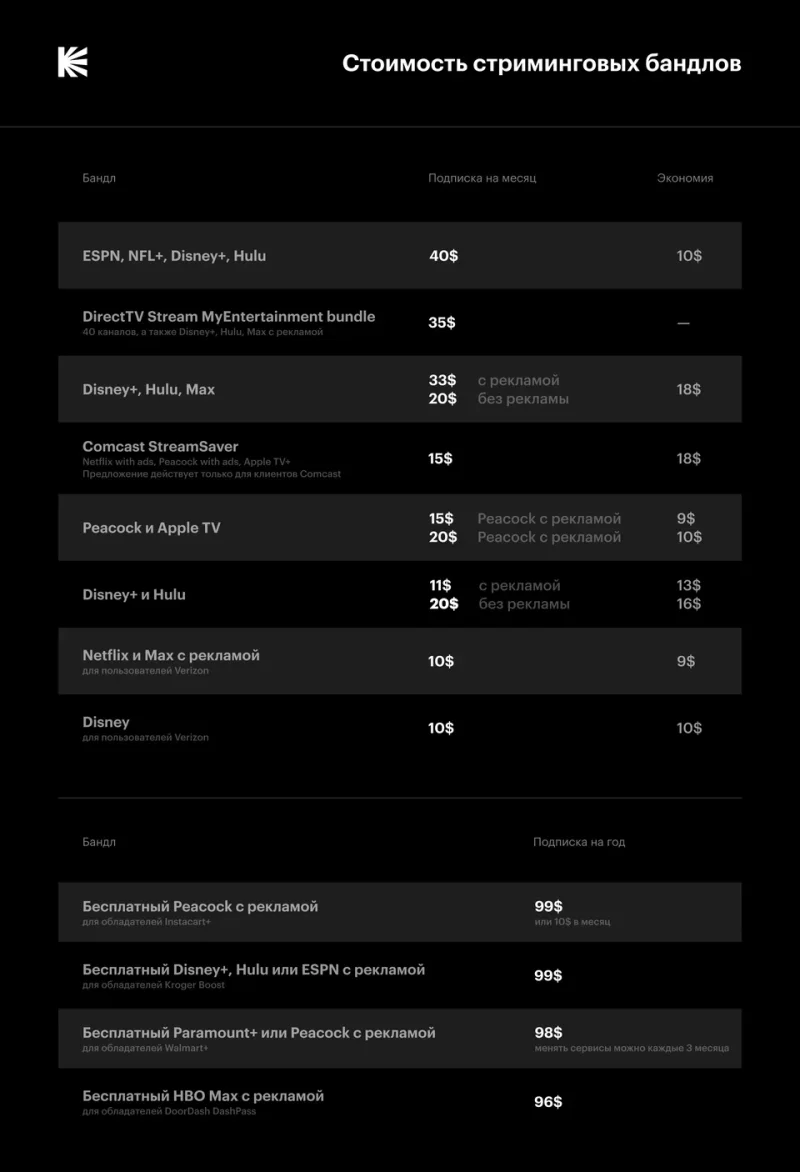 При этом на рынке есть бандлы, предлагающие подписку на Netflix в пакете с другими сервисами, но поставщиками в данном случае выступают или операторы мобильного интернета, например Verizon и T-Mobile, или производители телевизоров и телевизионных приставок. А самым необычным партнером неожиданно оказались гипермаркеты, ресторанные сети и сервисы по доставке еды. Так, например, HBO Max (с рекламой) бесплатно доступен обладателям DashPass (96 долларов в год) от доставки DoorDash, Disney+ (с рекламой) — владельцам членства в сети супермаркетов Kroger Boost (99 долларов в год), а Paramount+ или Peacock (оба с рекламой) — подписчикам Walmart+ (98 долларов в год).