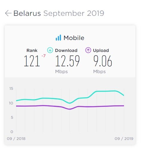 Согласно данным нового отчёта Беларусь занимает 121 место в мировом рейтинге по скорости мобильного доступа в сеть с результатом 12,59 Мбит/с (Download) и 9,06 Мбит/с (Upload). Наша страна уступает практически всем странам тропической Африки, которые есть в рейтинге. Не обошла нас еще только Руанда (136 место в рейтинге).