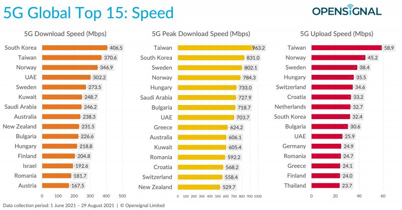 Самая высокая пиковая скорость загрузки в 5G-сетях на этот раз зафиксирована в Тайване - 963,2 Мбит/с. В Южной Корее и Швеции максимальная скорость скачивания при подключении к 5G достигала 831 и 802,1 Мбит/с, а в Швеции, Норвегии, Венгрии, Саудовской Аравии, Болгарии и ОАЭ результаты превысили 700 Мбит/с.