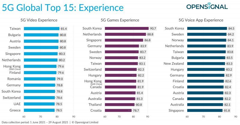 В категории 5G Video Experience, характеризующей пользовательский опыт при стриминге мобильного видео, шесть стран (Тайвань, Болгария, Австрия, Швеция, Сингапур и Нидерланды) набрали свыше 80 баллов из 100 возможных. При этом все 15 государств в рейтинге получили больше 75 баллов, что соответствует оценке ″отлично″. Нидерланды, которые в апреле лидировали по качеству мобильного видео в 5G-сетях, теперь опустились на пятую строчку, а на первое место вышел Тайвань.