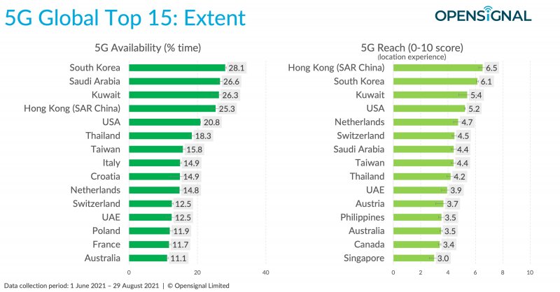 Южная Корея, Саудовская Аравия и Кувейт стали лидерами по критерию 5G Availability, отображающему, какую часть времени пользователи проводят в 5G-сетях. Также в топ-5 вошли Гонконг и США, но в большинстве рассмотренных государств результаты были ниже 20%. Меньше всего повезло пользователям в Польше, Франции и Австралии - они подключены к 5G-сетям лишь около 11% времени.