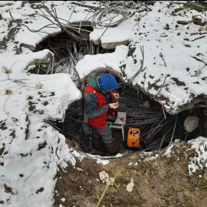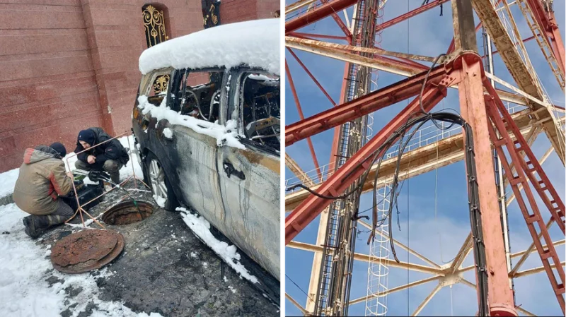 Провайдер интернета Triolan стал жертвой кибератак, но физически компания тоже пострадала. На фото, которые выложила компания в телеграмме, их техник во время работы в Харькове.