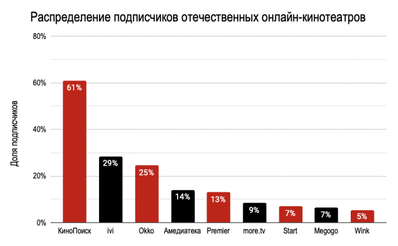 Пятерка лидеров среди отечественных площадок получилась следующей: “КиноПоиск” (61%), ivi (28%), Okko (25%), Амедиатека (14%) и Premier (13%). Примечательно, что первая тройка совпала с исследованием TelecomDaily, но расположилась в другом порядке.