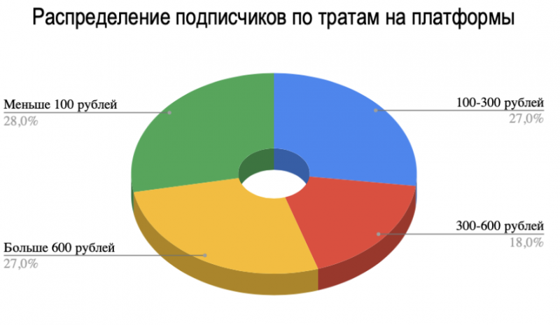 При этом явной разницы в процентом отношении по тратам на онлайн-кинотеатры нет. Порядка 28% пользователей тратят меньше 100 рублей (варианта ответа “Не трачу совсем” не было), а 27% — более 600 рублей.