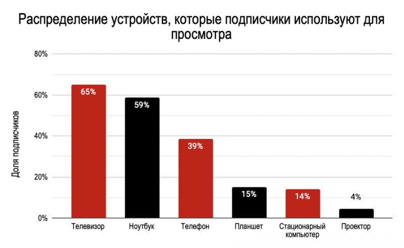 Телевизор, ноутбук и телефон оказались самыми популярными устройствами для просмотра видеоконтента: 65% пользуются именно телевизором.