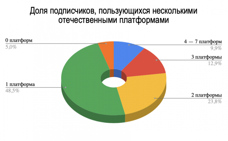 Распределение по числу платформ, которыми пользуется аудитория, оказалось следующим: на 4-7 отечественных онлайн-кинотеатров подписаны порядка 9% опрошенных, тремя площадками пользуются 13% опрошенных, двумя площадками — 24%, а одной — 49%. Ни одной отечественной площадкой не пользуются 5%.