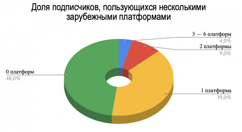 Заметное разделение получилось среди пользователей зарубежных платформ. Так, 3-6 онлайн-кинотеатрами пользуются около 4% опрошенных, двумя — 9%, а одной — 39%. Такое отличие от отечественных площадок можно связать с недоступностью множества из иностранных на территории России, а также с отсутствием у некоторых бесплатного пробного периода.