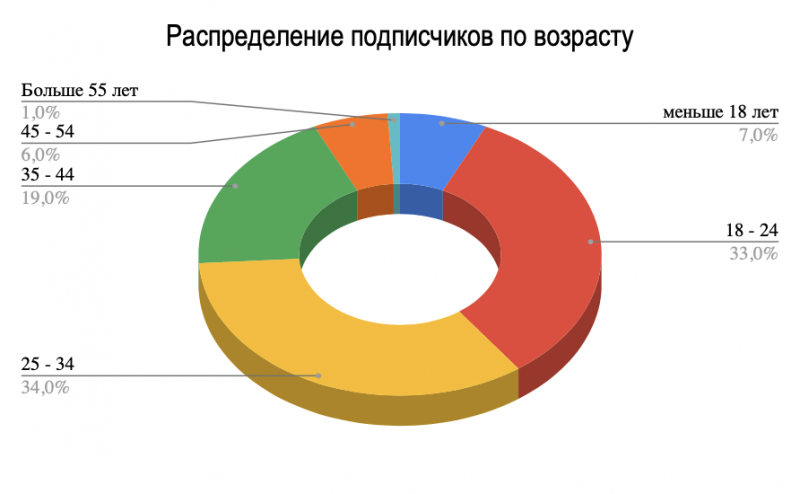 Аудитория почти поровну разделилась по половому признаку — 49% женщин и 51 мужчин. Ожидаемо наиболее многочисленными возрастными категориями оказались 25-34 лет (34%) и 18-24 лет (33%).