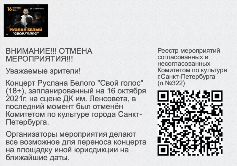 Белый отметил, что на выступление в Петербурге продали все билеты, всё было «юридически чисто». Но накануне выступления на сайте Комитета по делам культуры города появлялось объявление, что концерт не согласован. Сейчас сообщение удалено, страница с реестром несогласованных мероприятий тоже пропала, однако информация сохранилась на странице площадки.